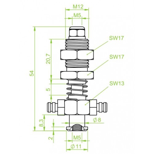 Spring leveler, V-Connection laterally: 2x Ø 4.9 mm, S-Connection: female thread M5, Travel= 5 mm, Thread dimension: M12, Length: 54 mm