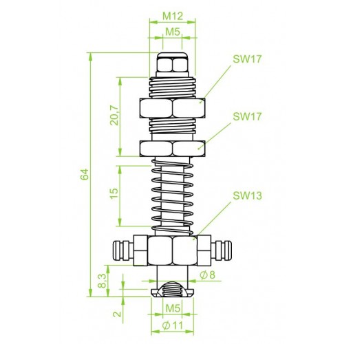 Spring leveler, V-Connection laterally: 2x Ø 4.9 mm, S-Connection: female thread M5, Travel= 15 mm, Thread dimension: M12, Length: 63.8 mm