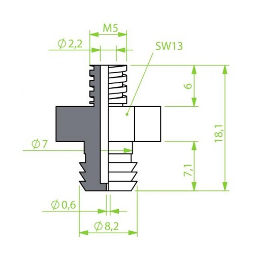 A male thread M5 fitting for use with suction cups with a borehole diameter of 0.6 mm, ideal for small-scale applications requiring precision fitting.