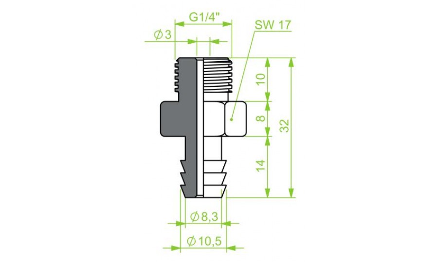 A standard male thread 1/4" fitting for use with suction cups, typically used in a variety of industrial applications.